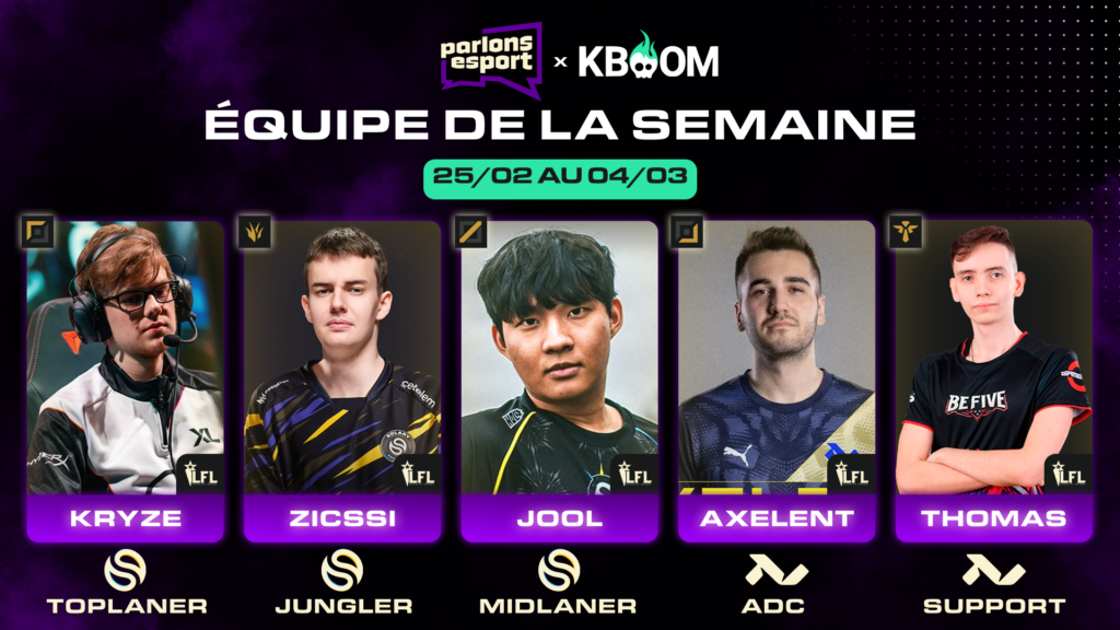 Comme chaque semaine, vous pourrez retrouver ici la Team Of The Week LFL en partenariat avec l’application de Fantasy League et prédictions esport Kboom.gg.